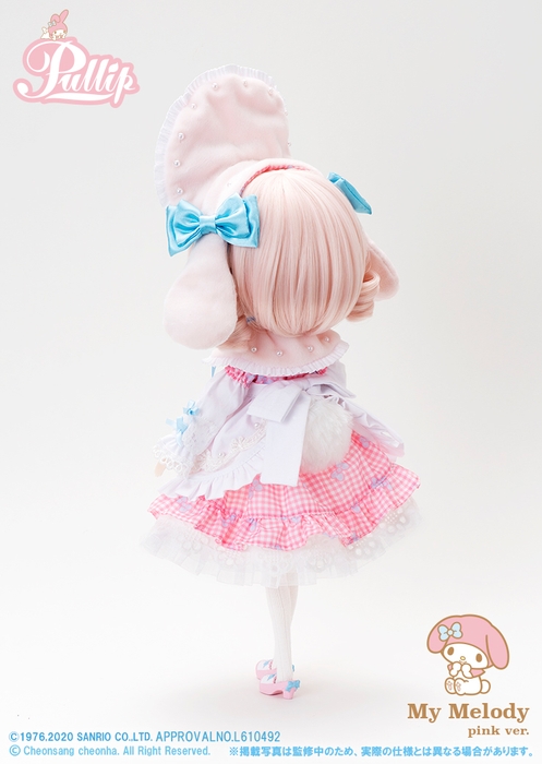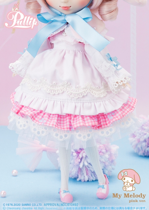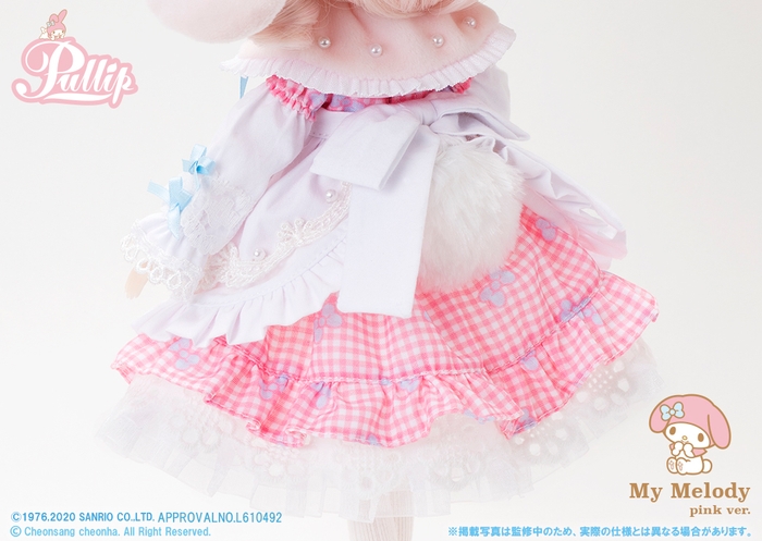 水色のリボンがよく似合うピンクを中心とした今回のコラボドールは、ヘアメイクも服装も女の子らしいあま〜いコーディネートです。ヘッドドレスには垂れ耳、ワンピースの後ろにはふわふわの尻尾が覗き、大きな黒い瞳もマイメロディらしさを感じるこだわりのデザインです。