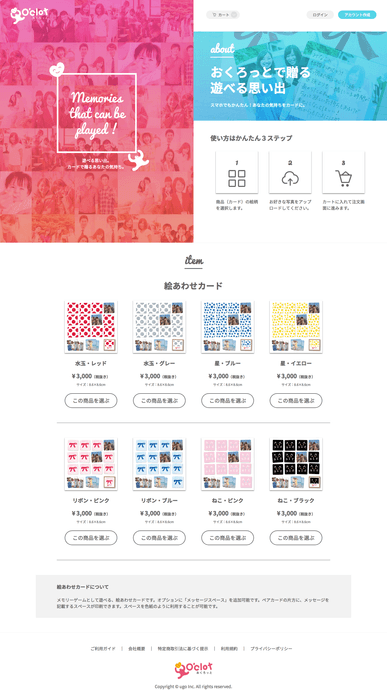 「おくろっと( https://www.oclot.jp )」(以下、本サービス)ではこれまで、iPhoneアプリとして年賀はがき印刷の販売を行ってきました。年賀はがき印刷を当社が提供する「スプリント年賀状( https://www.suprint.jp/nenga/ )」に統合したこと、およびiPhoneアプリ以外の提供を実施することを目的として、パソコン・スマートフォンで利用できるWEBアプリケーションにフルリニューアルいたしました。