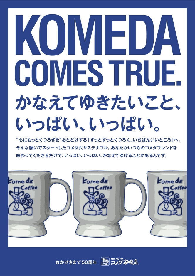 コメダ珈琲店(以下「コメダ」)は1968年の創業以来、喫茶文化が根付く名古屋を中心にフルサービス型の喫茶店として“くつろぎの場”を提供し、創業50周年を迎えました。現在は国内外の様々な地域に出店し、お客様をお迎えしております。50周年という節目を迎え、“心にもっとくつろぎを”を50周年ミッション宣言として掲げ、お客様により一層おくつろぎいただけるよう、そして「くつろぐ、いちばんいいところ」を永遠に持続させるべく、「KOMEDA COMES TRUE.」を合言葉にプロジェクトをスタートさせます。