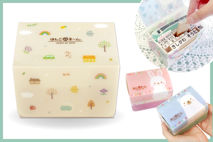 お名前スタンプを立てて収納できるオリジナルケースの絵柄はシロクマ・ウサギ・なちゅらるBOXのいずれかからお好みでチョイスできます。