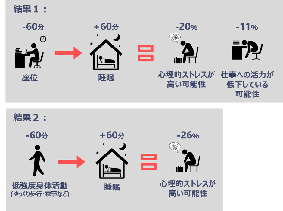 ◎具体的には、統計学的予測により、主に職場での座位行動や低強度身体活動の時間を1日当たり60分減らして、睡眠に充てると、メンタルヘルスが不良になることが11-26%程度低くなる可能性が示された