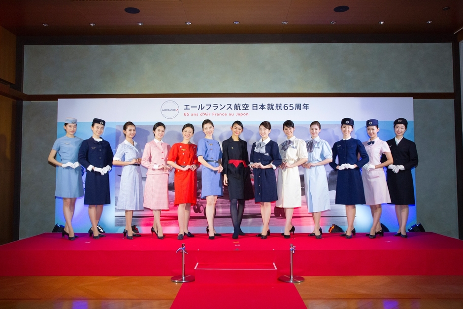 2017年11月27日に日本就航65周年を迎えたエールフランス航空は2017年12月14日、駐日フランス大使公邸にて記念レセプションを開催し、歴代の客室乗務員ユニフォームのファッションショーを開催しました。当日披露されたのは1952年日本就航当時に着用されていたものから現在までの全13着です。これらの制服は全て当時実際に着用されていた、オリジナルです。現在もエールフランス航空本社にある文化遺産部で大切に管理され保管しています。