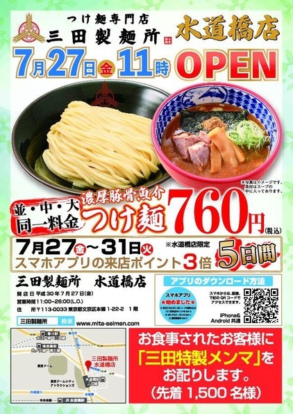 オープンを記念しまして、7月27日(金)から7月31日(火)までの5日間、水道橋店にお越しいただいた方限定で、三田製麺所公式アプリの来店スタンプが3倍になるキャンペーンを実施いたします。こちらのスタンプを貯めると、お得なトッピング無料券やつけ麺の無料券が貰えます。三田製麺所公式アプリは、お得なクーポンが定期的に貰えることにより好評を博し、2017年10月のローンチ以降順調に登録者数を伸ばし、2018年7月には累計ダウンロード数が6万を突破いたしました。