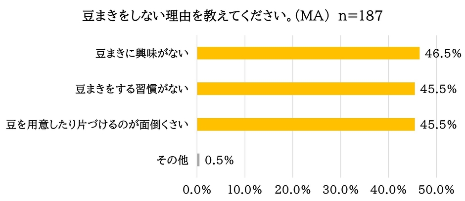 約6割は豆まきはしない。その理由は「興味がない」「習慣がない」「面倒くさいから」