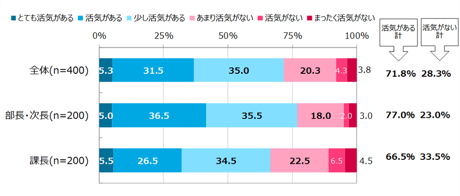 ・自身がマネジメントしている部や課が、現在活気があるか聞いたところ、全体では、「活気がある」(「とても活気がある」「活気がある」「少し活気がある」の計)が71.8%「活気がない」(「まったく活気がない」「活気がない」「あまり活気がない」の計)が28.3%となり、7割超の部課長が、自身のマネジメントしている部や課に「活気がある」と回答しました。