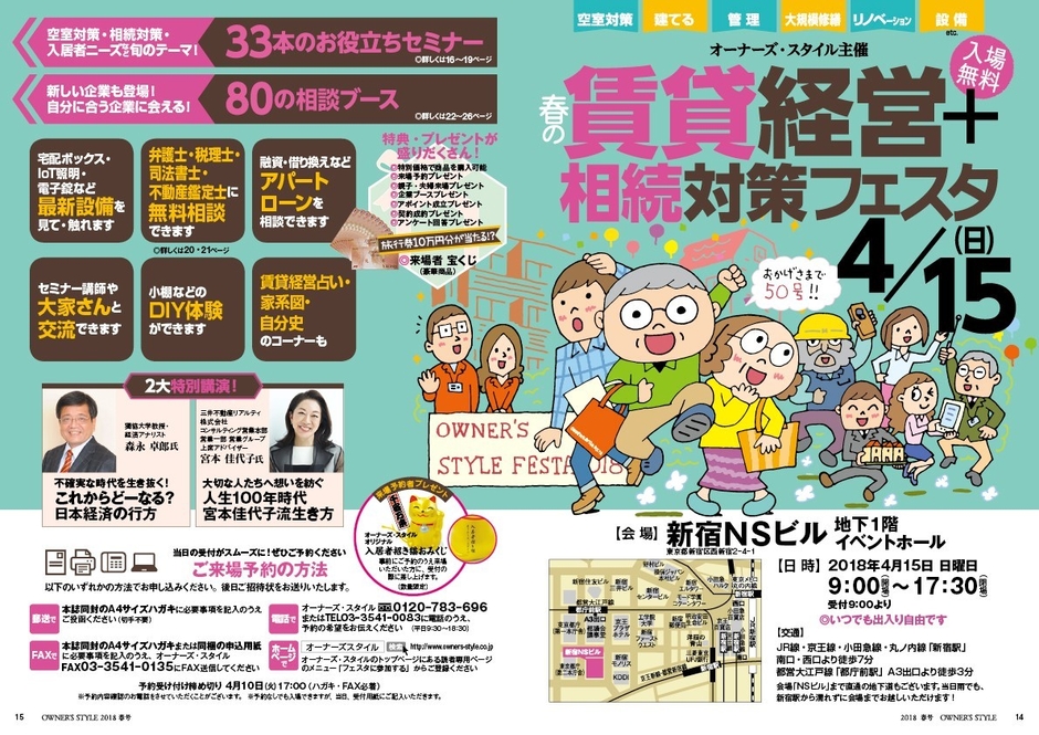 アベノミクスと日銀の超低金利・異次元の金融緩和で、活況を呈してきた3大都市圏と地方中枢都市の不動産市況。一方で少子高齢化、空家問題など賃貸経営を取り巻く環境には課題が山積みです。そんな時代の家主、地主のお悩みを解決するために、大家さん向け専門の出版社である株式会社オーナーズ・スタイル(所在地:東京都中央区、代表取締役:上田 英貴)は、大家さんだけを対象とした日本最大級のイベント、第15回「春の賃貸経営+相続対策フェスタ」を2018年4月15日(日)に新宿NSビルで開催します。
