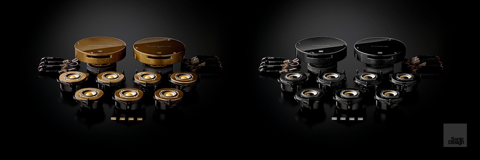 *“Sonic Design”ロゴバッジは「SCR-222L」用が銅製レリーフ・金メッキ仕上げ正方形タイプ、「SCR-222」用が銅製レリーフ・ロジウムメッキ仕上げ正方形タイプとなります。なお、このロゴバッジはご希望により一部または全部をレスオプションとすることもできます(同価格)。