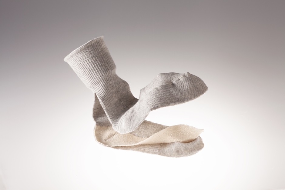 足元の冷えを取る『3SOUクツシタ』は内側が五本指に分かれている靴下ではありません。外観は普通の靴下の様に見えますが、内側が3つの層に分かれていることがこの靴下の最大の特徴です。足裏、指裏にあたる部分にもう一枚生地を入れ込んで内側と外側で機能の役割分担ができる編みを完成させました。しかも別の生地を縫い合わせるのではなく、セパレートに編み込む技術で作り込みました。