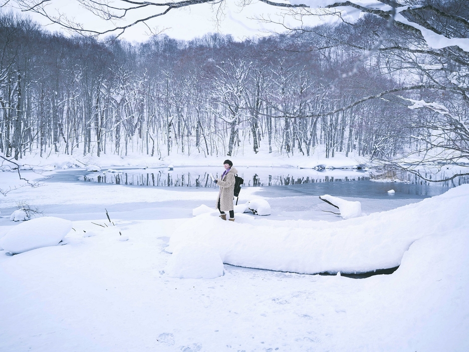 当アクティビティでは、ガイドが右も左もわからない森の中にある、迷路のスタート地点へゲストを案内します。スタート地点からは、どこへ行くもゲスト次第、大自然迷路の始まりです。林立するブナの木がまるで迷路のような森を抜けると、ゴールである美しい景色が待っています。コースは当日の天候に合わせてガイドが決めるので、どんな景色が待っているかは当日のお楽しみです。実施場所のひとつである「蔦の森」は、八甲田山の裾野に立地し、冬に八甲田山から吹き付ける寒冷な北西風「八甲田おろし」によって、道も足跡も消えてしまいます。春夏秋とたくさんの観光客が訪れるこの場所も、人の気配を感じることができない、あたり一面の銀世界が広がります。