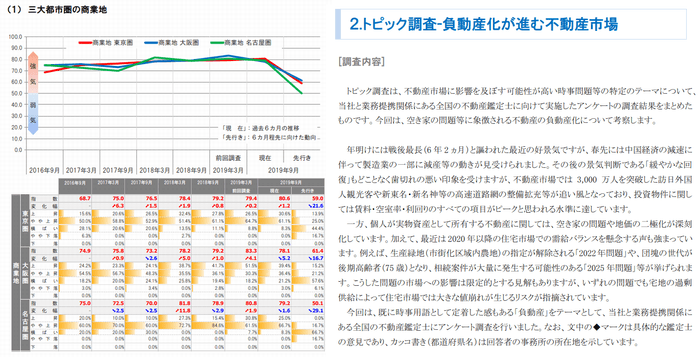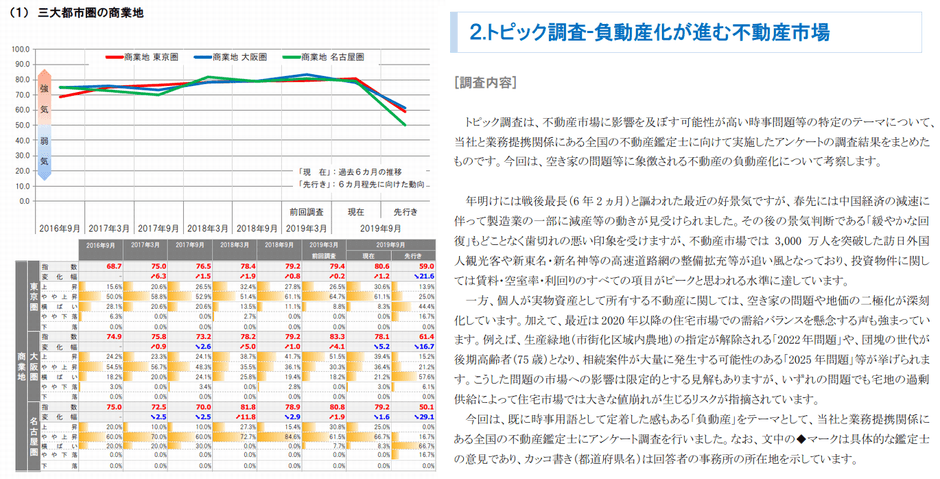 商業地指数の「現在」は、東京圏80.6、大阪圏78.1、名古屋圏79.2となりました。前回との比較では、東京圏が79.4からやや上昇、大阪圏は83.3から下落、名古屋圏は80.8からやや下落しています。また、「先行き」は東京圏59.0、大阪圏61.4、名古屋圏50.1と、いずれも現在より慎重な見方が増えています。