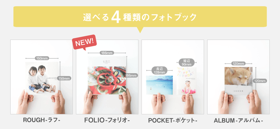 CDサイズの「ALBUM(アルバム)」、手のひらサイズの「POCKET(ポケット)たて・よこ」、15×15cmのスクエアタイプの「ROUGH(ラフ)」に加え、アプリで作成できるアイテムに高級厚紙製本の「FOLIO(フォリオ)」が仲間入り。
