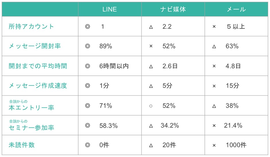 学生の意見として「説明会の案内やリマインドも、メールやナビのメッセージボックスだと埋もれてしまう。それに比べてLINEは見落とさないし、返事がしやすい。」との声が多く、学生側のメリットに寄り添うことで結果に繋がりました。