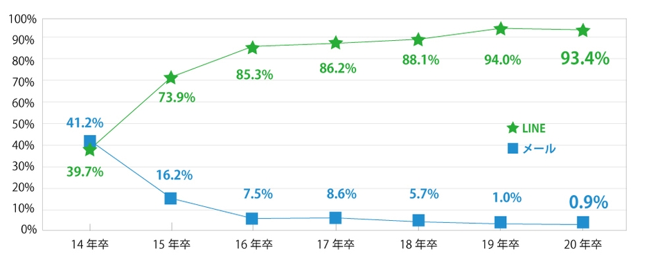 学生の主なコミュニケーションツールについて調査したところ、LINEを活用している人が93.4%にも上昇する結果が出ました。一方で2020年卒のメール利用は0.9%まで減少しており、学生にとってメールを使うシーンがほとんどないということが数値から読み取れます。LINEは普段のコミュニケーションとしてもよく使われているため、密に連絡を取ることができ学生の不安払拭の一部として効果が出せます。