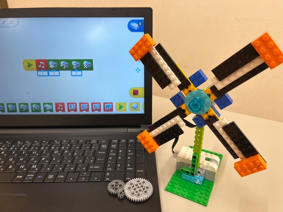 体験会では、レゴ(R)ブロックで作成した扇風機をプログラミングで動かします。ただ決まった形を作るだけではなく、ギアを使った実験や羽根の形の改良を通して、子どもたちの考える力を引き出します。子どもたちがじっくり考える姿や、試行錯誤しながらプログラムを作る様子など、普段とは違う一面が見られると保護者の方にも好評の体験です。