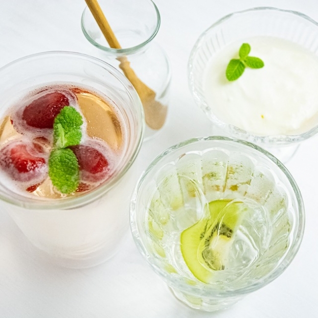 お水やソーダで割ってビネガードリンクとして楽しんだり、かき氷のシロップとしてつかったり、ヨーグルトにかけてスッキリヨーグルトにしたり、お酒で割ってビネガーサワーとしても楽しめます。