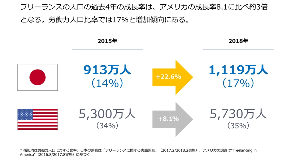 アメリカの調査では、2027年にはフリーランス人口がノンフリーランスの人口を超えるという結果も出ており、今後日本においても広義のフリーランスが伸びる余地が見込めます。