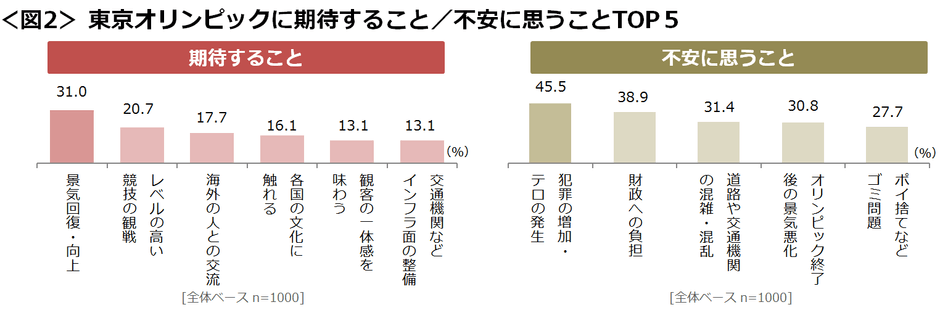 ●開催に伴って期待することは「景気回復・向上」(31%)がトップ。次いで「レベルの高い競技の観戦」(21%)、「海外の人との交流」(18%)となった。不安に思うことは「犯罪の増加・テロの発生」が46%と半数近くを占めてトップ。次いで「財政への負担」(39%)、「道路や交通機関の混雑・混乱」(31%)となり、経済活性化など開催による副次的効果や海外の人・文化の交流を期待しつつも、犯罪や財政負担を懸念する声が多く見られた <図2>