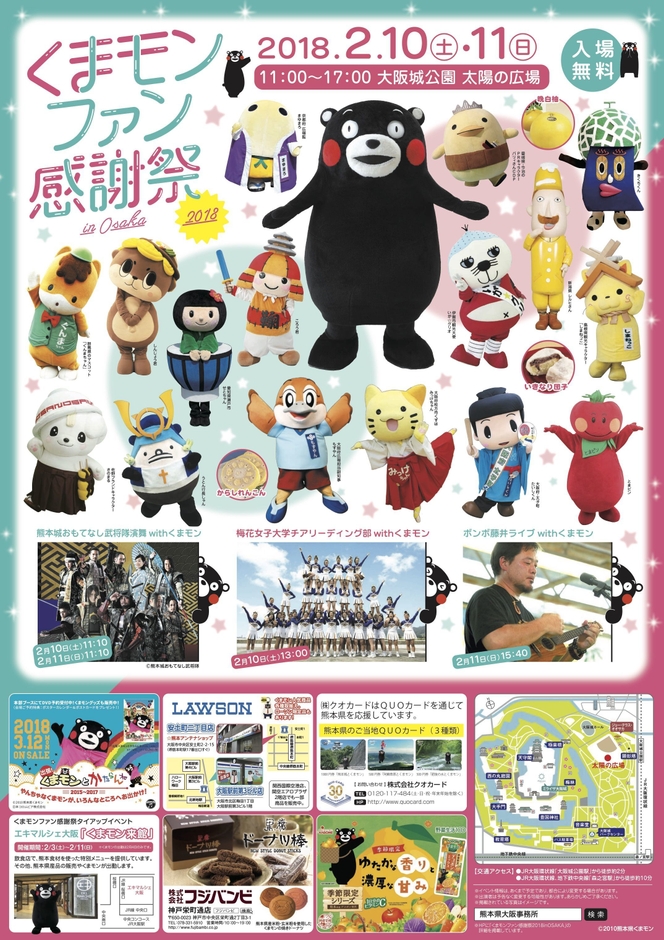 熊本県大阪事務所(大阪市北区梅田1-1-3-2100 大阪駅前第3ビル 21F)は、2018年2月10日(土)・11日(日)、「くまモン」ファンの皆さまの日々の応援と、関西からの様々な支援への感謝の気持ちをこめて、熊本県の魅力を体感できるイベント「くまモンファン感謝祭2018 in OSAKA」を開催します。