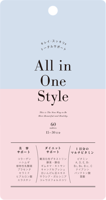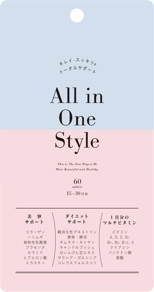 「All in One Style」は1つで5役を果たすサプリメントです。コラーゲンやはと麦を含む7種類の美容サポート成分をはじめ、スッキリ・運動するカラダ・カロリーバランスのダイエットサポート成分10種類と1日分のマルチビタミンを配合。食べたいあなたのキレイ・スッキリをサポートします。