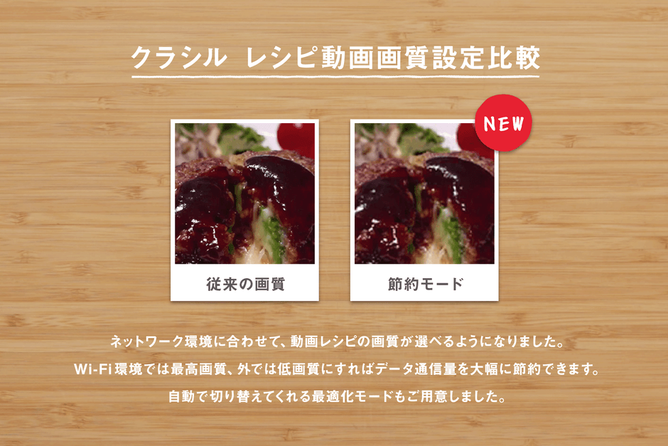 レシピ動画サービス「クラシル」は、「70億人に1日3回の幸せを届ける」をミッションに、これまでに12,000件を超えるレシピ動画を配信してまいりました。より多くの生活シーンでご利用いただくことが増える中、「通信量が気になる」といった声をいただくことも多くなりました。新機能開始により、データ通信量を大幅に削減することができ、より快適にクラシルを楽しんでいただくことが可能になります。