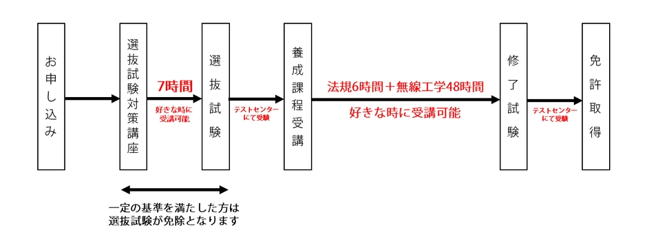 総務省の認可を受けた事業者にて決められたカリキュラムを受講し、当該事業者が作成した修了試験に合格することで、国家試験を受けることなく国家資格を取得することができる制度のことです。選抜試験に合格することで誰でも受講することができますが、一定の条件を満たせば選抜試験は免除となります(※)。