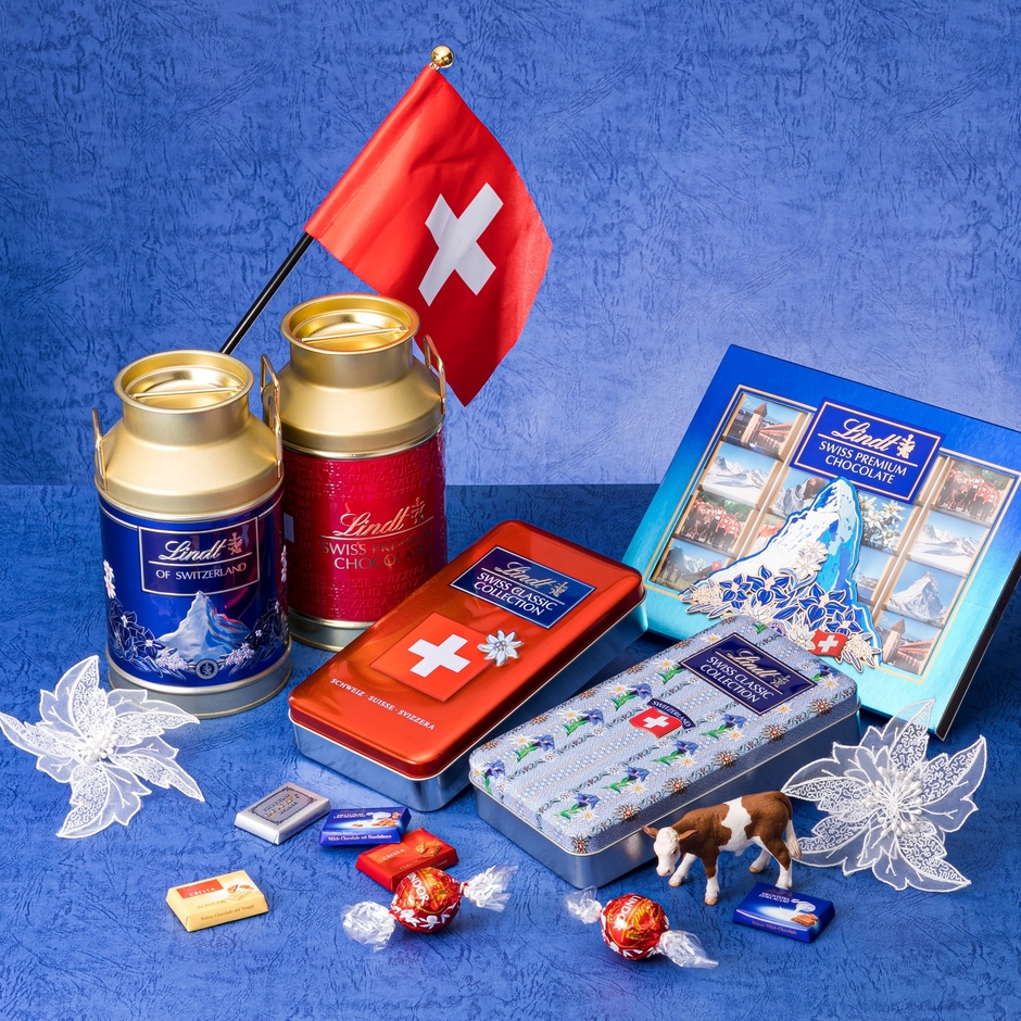 スイスの国旗、国花であるエーデルワイスがあしらわれたスイス伝統衣装の生地、名峰マッターホルンがデザインされた3種類の缶からお選びいただけます。一口サイズの「ナポリタン」チョコレートは、なめらかなフィリング入りやサクサク食感のナッツ入りなど、リンドール ミルク、ミルク、ダーク、ヘーゼルナッツ、クレスタミルク、クレスタホワイト、全6種類の豊富なフレーバーを詰め合わせています。※オンラインショップでの取り扱いはございません。