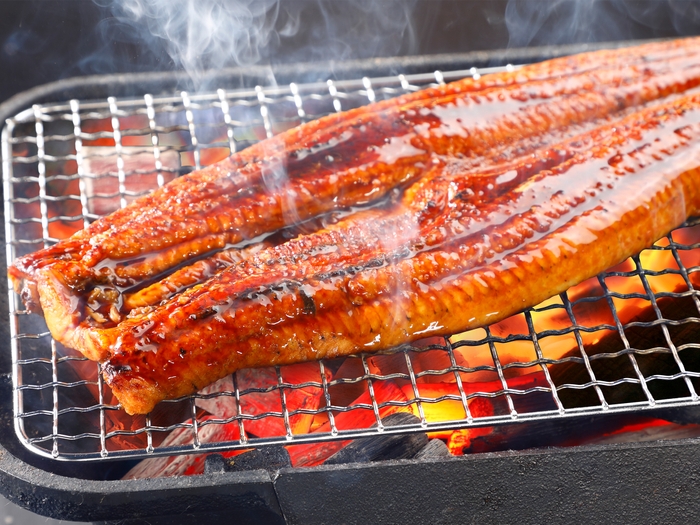 夕食バイキング時に特大鰻の炭火焼き(現地販売価格3,000円)を一本サービス(大人2名につき1本のご提供)