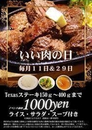 毎月11日・29日をいい肉イベントと題し、Texasステーキ400gまでを1,000円(ライス、サラダ、スープ、コーヒー付き)で提供しております。