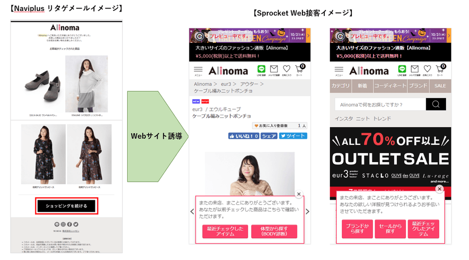 「NaviPlusリタゲメール」と「Sprocket」が連携することで、ECサイトを変更することなく再来訪の促進と再来訪されたユーザーの心情に合わせた精度の高いOne to OneのWeb接客を可能にします。