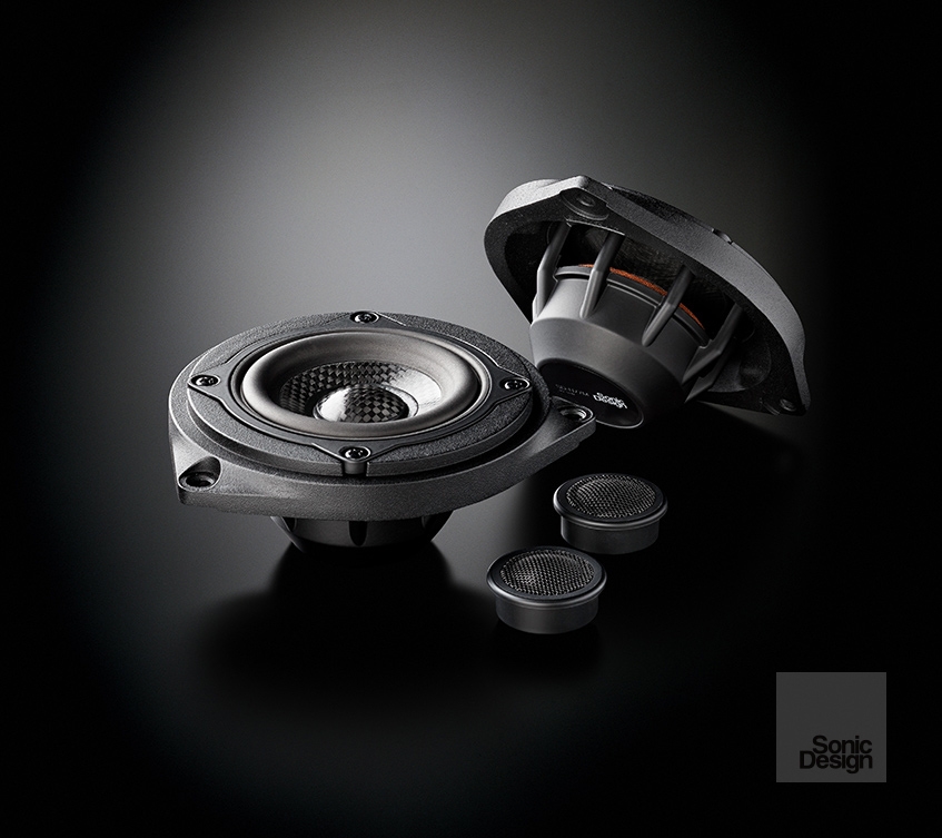 ソニックデザイン独自のマイクロファイバー振動板によって各ウーファーユニットとのサウンドキャラクターの統一を図った、高音質&コンパクト設計の18mmドームトゥイーター=SD-T18型を全機種に投入しました。振動系の生産精度を高めることでマグネットとボイスコイルとの間隔をより狭め、磁気回路の高効率化を目指したナローギャップ・モーターシステムとも相まって、豊かな音圧と情報量、高域端までスムースに伸びた周波数レスポンスを実現。さらに、組み合わせるユニットごとの再生特性に合わせて最適化したハイパス/ローパス独立式ネットワーク、配線加工なしで純正スピーカーと交換できる純正タイプ配線カプラーも全機種に採用しています。