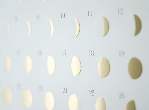 “月=夜”のイメージから、背景色にネイビーやブラックが使われるムーンカレンダーで敢えて「白」を起用。可愛らしさを抑え清潔感のあるシンプルなデザインに仕上げました。また、月の満ち欠けをエンボス加工と金の箔押しで高級感を表現しています。