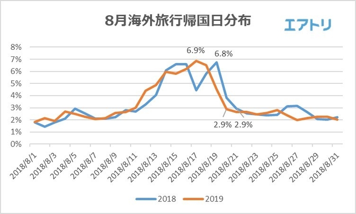 2018年の場合、8月11日から帰国者が緩やかに増えていき、8月19日に帰国ピーク(6.8%)を迎えます。その後、帰国者は一気に減り、8月21日には2.9%まで下がりました。一方、今年は8月11日から一気に帰国者が増え、2018年よりも2日早い8月17日に帰国ピーク(6.9%)を迎えています。そして2018年より1日早い8月20日には2.9%まで下がりました。