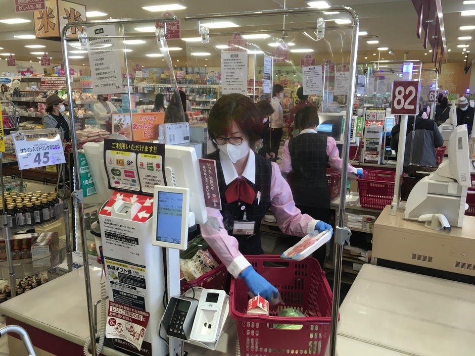 レジ担当責任者は、「お客様が安心してお買物できるように、また、レジ担当者が安心して働けるように、感染拡大防止の対策を徹底していく」としております。お客様にはレジでお並びいただく際に約1.8m間隔を確保するご協力をお願いします。