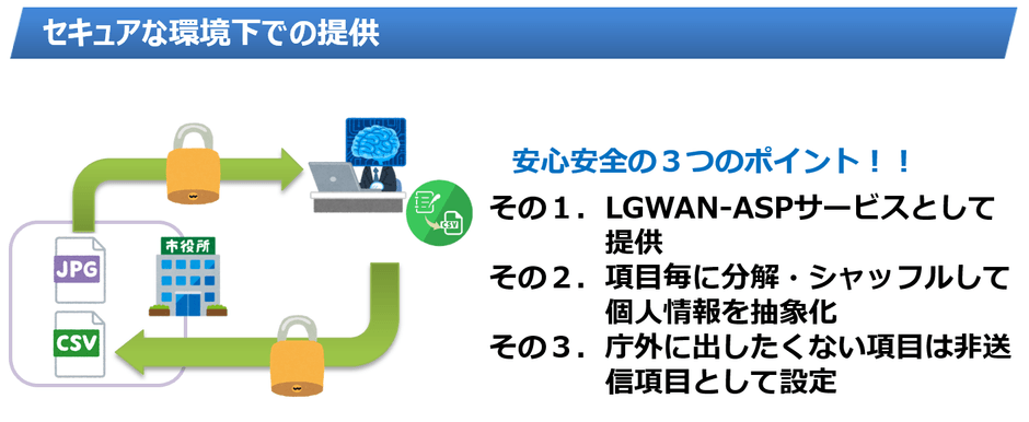 庁外への送信前に読み込んだ手書き書類イメージを項目毎に分割・シャッフルする抽象化機能や非送信項目を設定する機能等、地方公共団体のセキュリティポリシーに配慮したセキュリティ機能を備えております。