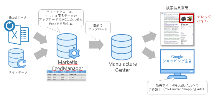 メーカーが「Manufacturer Center」を利用する際に、同サービスが指定する形式で商品リストをファイル化したデータファイルを作成し、都度アップロードする必要がありました。当社の「Marketia Feed Manager」を導入することでデータフィードを自動的に生成して送信することが可能となり、運用管理を大幅に効率化することが可能となります。