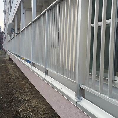 アルミZ型笠木は、バルコニー手すり下端の改修工事において笠木交換用として簡易施工できます。モルタルによるかさ上げの必要がなく、通常の笠木に比べ施工が楽で予算削減できます。L型の防水押えと違い、立ち上がりがあるので転落・落下防止になります。