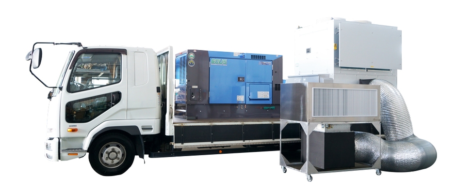 ビル空調にも使用される大型空調機と発電機を同時に車両に搭載することで、いつでもどこでもすぐに快適な空気を提供することができる大型屋外空調 特殊車両です。