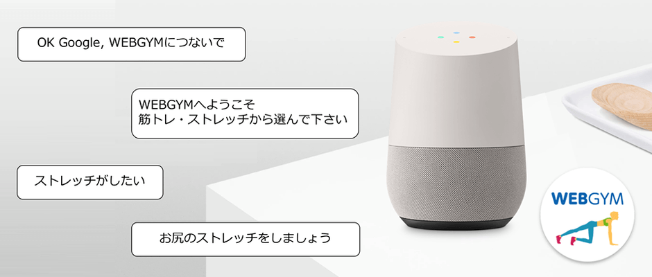 「OK Google, WEBGYMにつないで」と声をかけるだけで、Google Home (※1)で筋力トレーニング(以下 筋トレ)やストレッチのコンテンツをお使いいただけます。忙しくてジムに通えない、近くにジムがない、といった悩みに応えるため、「いつでも、どこでも、誰でも」をコンセプトにWEBGYMのサービスを提供してきました。そのノウハウを駆使し、音声ガイダンスのみでエクササイズができるコンテンツ開発に至りました。