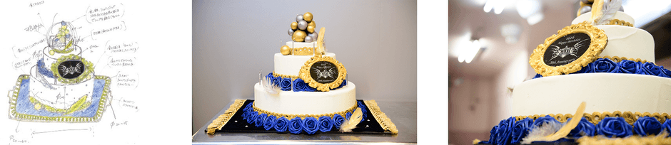 GACKTさんのイメージを表現するため、白を基調にしたベースのケーキ土台に、円周をゴールドのチョコレートで作った装飾でデコレーション。羽と青いバラで華やかさを加えています。また、ライブのビジュアルと闇色から宇宙をイメージし、ゴールドとシルバーの球体をケーキのトップに飾り、表現しています。