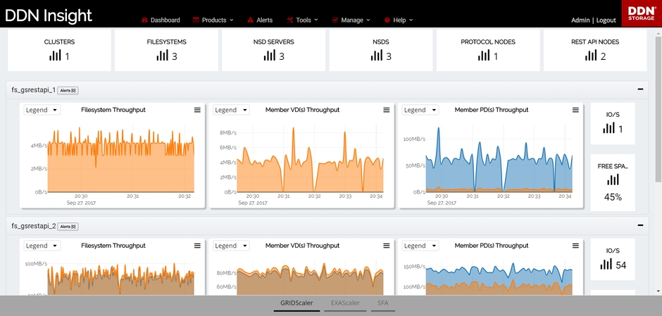 DDN Insightは、DDNの次世代型監視ソフトウェアです。導入が容易で、複数のファイルシステムやストレージアプライアンスを抱える、大規模で最も困難な環境を監視することができます。DDN Insightを使用すると、問題箇所、ボトルネック、そして誤動作しているアプリケーションをすばやく特定して対処できます。SFA、EXAScaler(R)、GRIDScaler(R)とIMEと緊密に統合することで、DDN Insightは、お客様に対して完全なDDNベースのエコシステムを包括的に監視する直感的な方法を提供します。