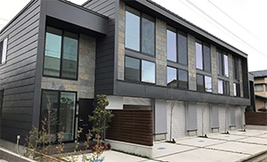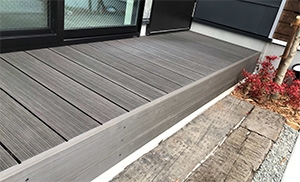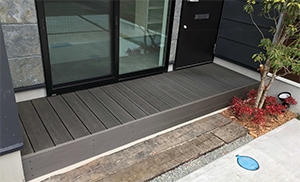 今回案件のアパート一階両端の住居は駐車場が併設されており、ベランダから駐車場までのアプローチをウッドデッキにしたいとの施主様からのご要望を受け、風雨にさらされますので耐久性のある再生木材をご提案。