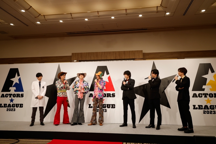 最後は、岡宮が「早速サプライズがあってビックリしてますが、今年もみんなで刺激をもらいながら素晴らしい1日を作れるように頑張ります」と、高野が「競技はナマモノなので去年と同じことをやっても違うものになると思いますが、新しいものも取り入れていきますので、ぜひ楽しみにしていてください」と、黒羽が「荒牧所長がいいサプライズを用意してくださいました。このACTORS☆LEAGUEがさらに幅広く、進化できるというのを僕自身確信しております。素敵なものをお届けできるようにこれからも頑張っていきます。二つのACTORS☆LEAGUEをこれからも応援していただけたらと思います」と、本家『ACTORS☆LEAGUE』のプロデューサー3人がメッセージを届け、黒羽と唐橋が握手をして、会見を締め括った。