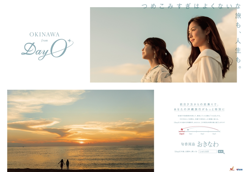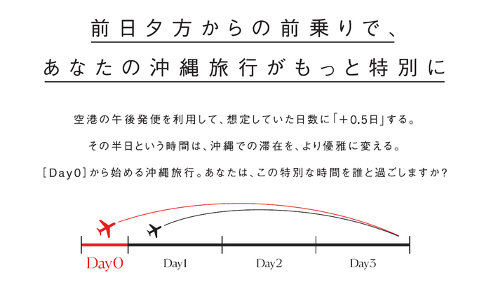 午後出発便(13:00~18:00頃を想定)を利用し、想定していた旅程よりも半日前乗りすることで旅程全体にゆとりが生まれます。到着した夕方や夜、翌日の朝などの時間を有効活用し、落ち着いたちょっと贅沢で特別な沖縄時間を過ごす旅のスタイルを、「Day0」と名付けました。「Day0」の浸透を通じて、沖縄旅行の更なる需要喚起と魅力発信を目指します。