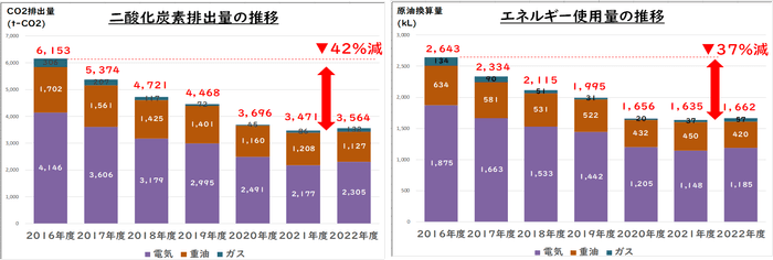 第1次快適エコ活動実施前の2016年と、2022年との比較では、二酸化炭素排出量42%削減、エネルギー使用量37%削減の成果となっています。今後も「地球環境にやさしい高付加価値な温泉リゾートを創造する」目標のため各種施策を実行していきます。