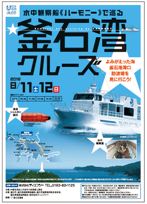 本イベントは、一般社団法人日本中小型造船工業会と日本財団が実施する「海と日本PROJECT」の一環として開催されます。「釜石湾クルーズ」では“よみがえった海 釜石港湾口防波堤を見に行こう!”を合言葉に、水中観察船『ハーモニー』で釜石港湾口防波堤、釜石大観音を巡るほか、船内の水中観察室から釜石湾の海中を一望するなど、普段とは一味違った釜石湾の情景を堪能して頂きます。また、ティエフシーやまだ工場で開発・建造した「津波シェルター」の展示も行います。