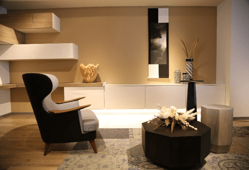 現代アートに昇華した掛軸と、金箔の照明を、 家具に合わせた住空間でコーディネート展示