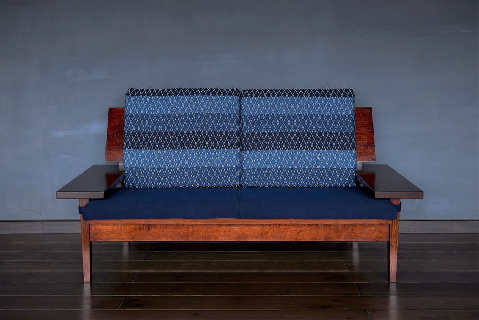 日本で古くから用いられ、現代でも広く愛される藍染めの布。そして、日本の森で時間をかけて育った楢(ナラ)に漆塗りを施した、美しいソファが完成しました。