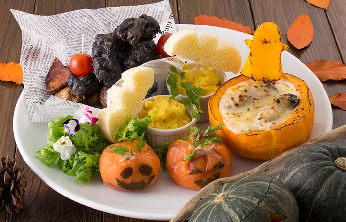 仮装してご来店いただき、ハロウィンバイキングをご注文いただきますと10%オフいたします。さらに、先着1,000名様に『ハロウィン前菜プレート』をプレゼントします。(お一人様一品限り、写真は2名様分)