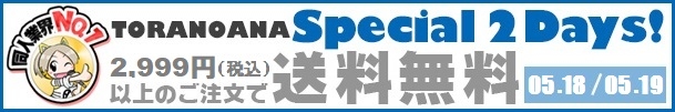 当キャンペーンは、日頃、とらのあなでお買い物いただくお客様のご愛顧に感謝し開催する、2019年5月18日(土)~19日(日)の48時間(2日間)限定企画です。とらのあな通販で通常は税込9,720円以上で送料無料のところ、当キャンペーン期間中は、【税込2,999円以上のご注文時で送料が無料】になります。