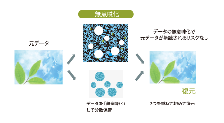 ZENMUは独自の秘密分散技術を用いて、データを意味のない形に変換・分割して、分散管理することが可能です。分割したデータ片は1つでも欠けていると復元することはできず、またそれぞれのデータ片からでは一部ですら推測できない全く「無意味」なものになります。全ての分散片が揃ってはじめて元の情報に復元可能となります。
